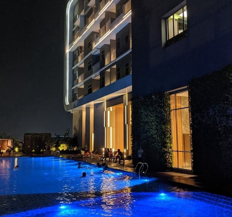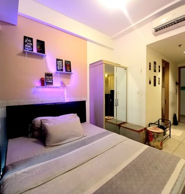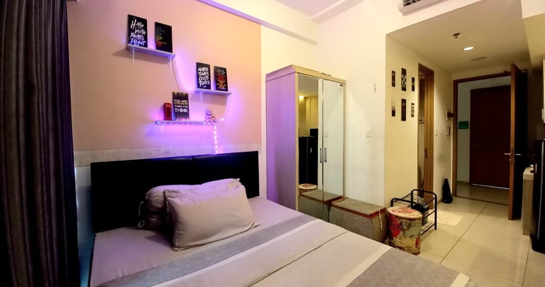 Kamar ini tampil lebih berkarakter dengan penggunaan lampu LED berwarna ungu yang memberikan kesan moody dan modern.