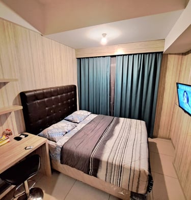 Kamar tidur ini memiliki desain minimalis modern yang memanfaatkan ruang secara efisien dengan nuansa warna yang hangat dan tenang.